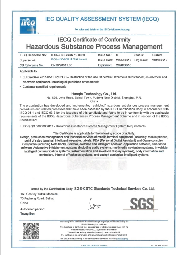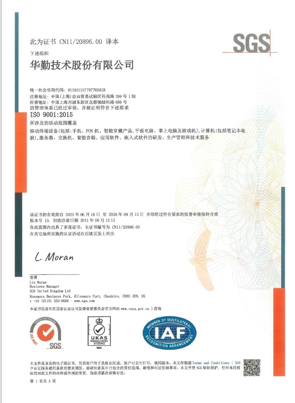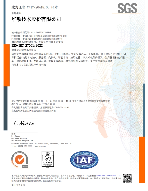 质量管理是一个系统的活动,实施品质管理必须建立品质体系。华勤高度重视体系建设,并先后通过ISO9001、QC080000、ISO14001、ISO45001、ISO/IEC27001、IATF16949、Aspice Level 2、ISO13485等认证,有效推动了公司制度、流程、业务模式的标准化,有效控制风险,为业务持续成功保驾护航。